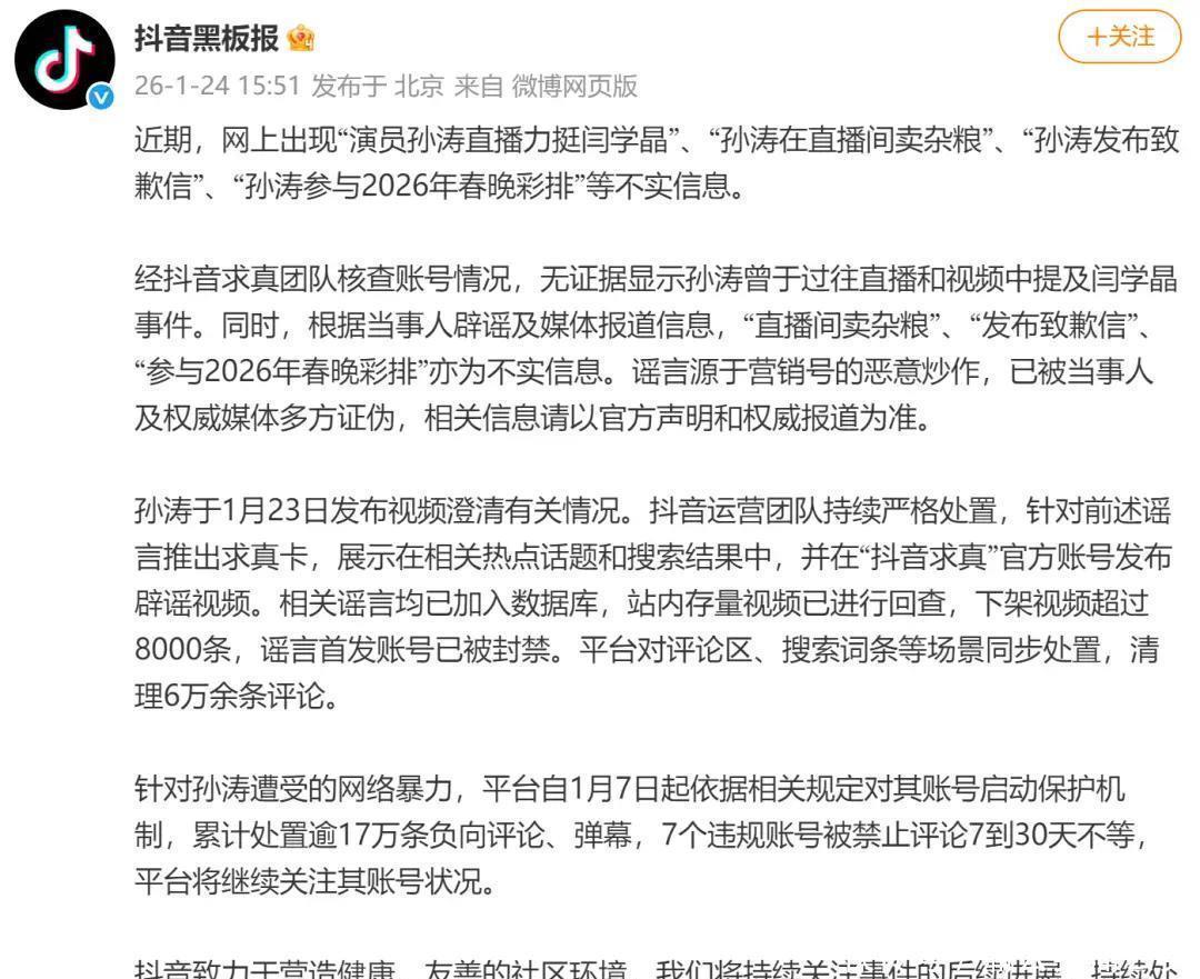就在孙涛宣布退出之前三天,他在1月23日先发了个澄清视频,直接点名几条热门传言,有人说他直播力挺闫学晶,有人传他写了道歉信,还有人说他在卖杂粮,他一条条否认这些说法,说全是假的,还说要起诉那些造谣的人,抖音“黑板报”第二天也出了报告,查了一圈,确认那些截图、文字和视频全都是拼凑伪造的,没人见过孙涛提闫学晶,也没人拍到他直播带货。